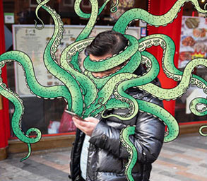 Colorful, invasive, slimy … With his little monsters, Andrew Rae envisions the smartphone as a portal between the virtual and the real, from which unknown life forms escape. To create his series entitled “Phone Buddies”, the London-based illustrator combined his talent with that of photographer Ruskin Kyle in order to anchor his creations in reality. The latter immortalized passers-by in the streets of London who kept their eyes glued to the screen of their smartphone, before Andrew Rae added his monsters to the images.